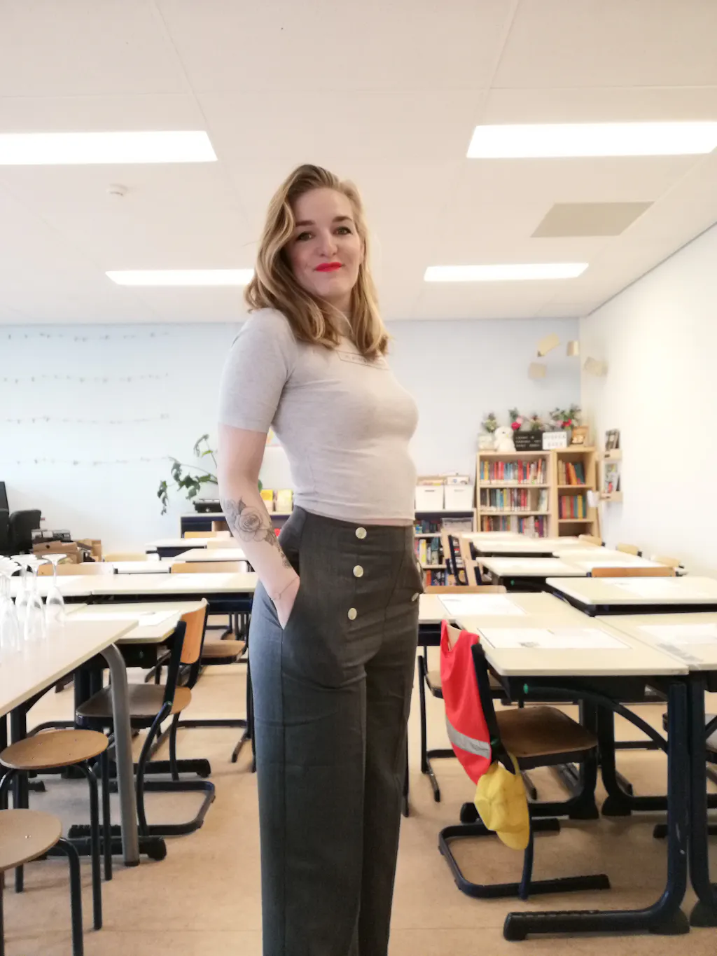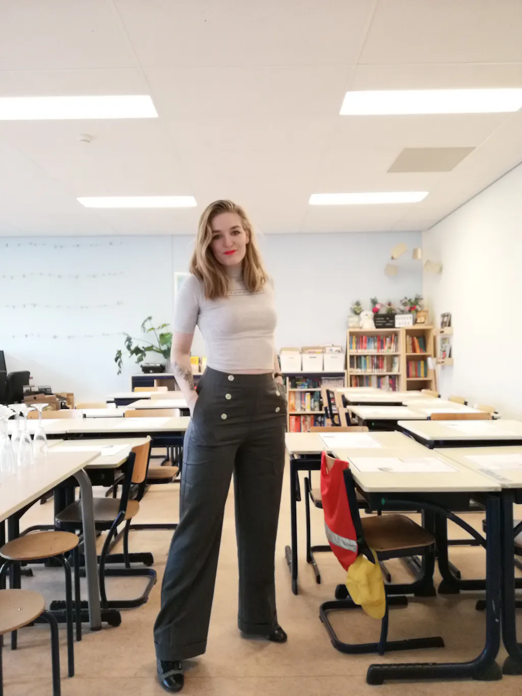 Her high waist is adorned with decorative buttons on the front, but actually closes with a zipper in the back. Pockets and fake-pockets on the bottom are a must, and the trouser legs have creases and rolled-up seams to make your legs look endless.