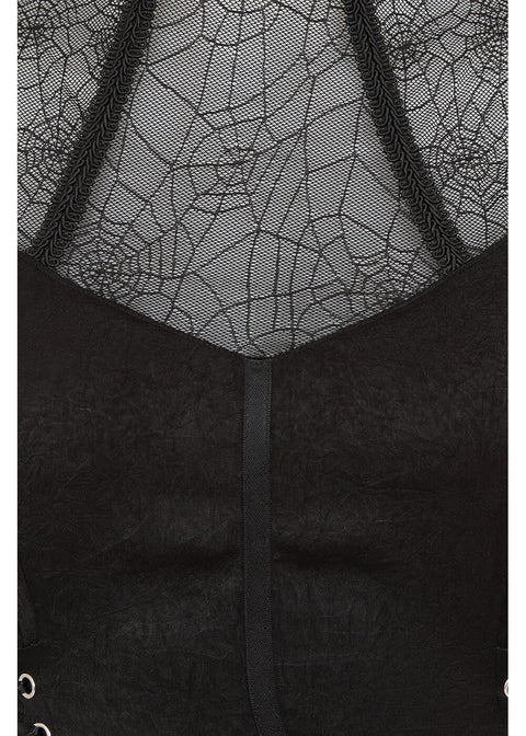 Spiderweb lace, lace-up details, and a flouncy hemline: how much Ghoulish charm can you pack into a dress? The smooth-feeling fabric features a unique texture, and the skirt extends longer on the sides, creating an enchanting effect from your broomstick (and simply from the ground). Cute, but let's make it Spooky!