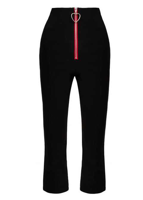 Lucie capribukserne har høj talje, en Vavavoom-tæt pasform til midt på læggen og en synlig lynlås med en stor hjerteformet lynlåstrækker. Diskret? Slet ikke. Og det hjerteformede udskæringsdetalje bagpå med rød kant og sløjfe… ren retro-kærlighed ♥