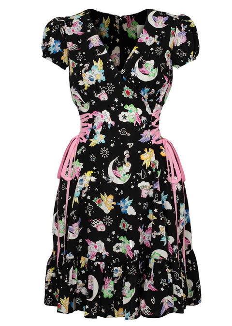 Kjolen kombinerer de bløde Care Bears med regnbueskydende kranier for en god dosis cute chaos, nærmest som et tattoo-flash, der er blevet levende. De pink snørrebånd i corsettet i siderne giver ekstra attitude og gør denne mini-kjole helt særlig ♥