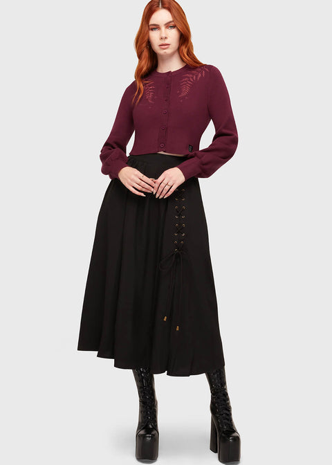 Lilla Killstar-cardigan med bregneinspireret design og mørk, romantisk stemning; blødt strik og afslappet fald til alternative outfits.