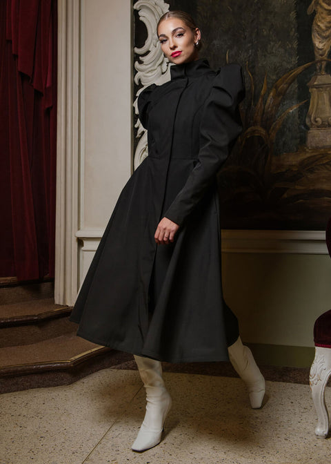 Dette er den svingende frakke, du altid har haft brug for: elegant, med 50'ernes vintage look og vandafvisende! Vær parat til at danse i regnen med din nye yndlingsfrakke fra RainSisters! Empress tilbyder nu det bedste fra begge verdener: en vandafvisende frakke med en charmerende pasform takket være prinsessesømme... Fra taljen breder den sig ud i en vid svingende nederdel, der selv holder en kjole med petticoat tør. Du vil slynge dig rundt i denne showstopper: og ingen vil stoppe dig! - Vandafvisende - Lommer - Lange ballonpuff ærmer - Høj krave - Lukkes med skjulte trykknapper - Breder sig ud fra taljen i en svingende nederdel - Kan bæres over en petticoat - Foret med italiensk satin - Falder til lige over knæene for en person på 1.70 m - 94% polyester - 6% polyamid - Rens eller vask i maskine ved 30c på skåneprogram (se label) - Ikke egnet til kraftig regn