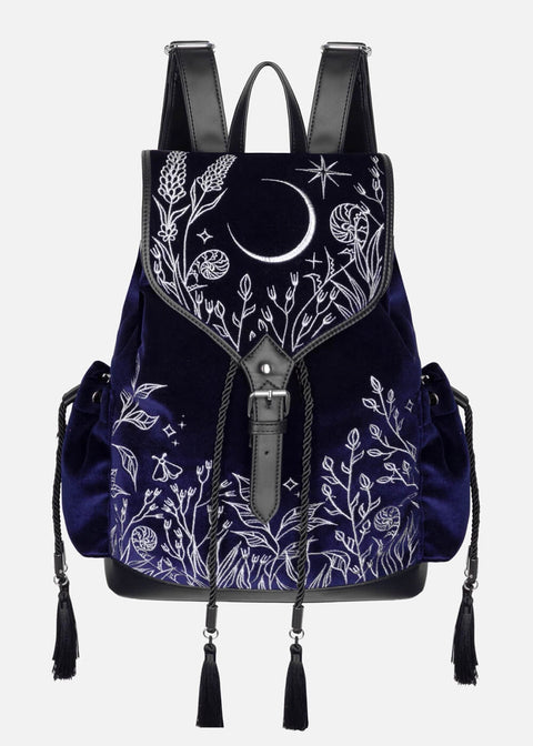 I fuld cottagecore-stil tager Moonlit Meadow pusten fra dig: mørkeblå faux-suede med mystiske broderier af en halvmåne, natsværmere og planter. Ligesom din magi er den også praktisk — præcis stor nok til alle dine daglige (eller natlige) fornødenheder. Hold dine witchy vibes tæt på ♥