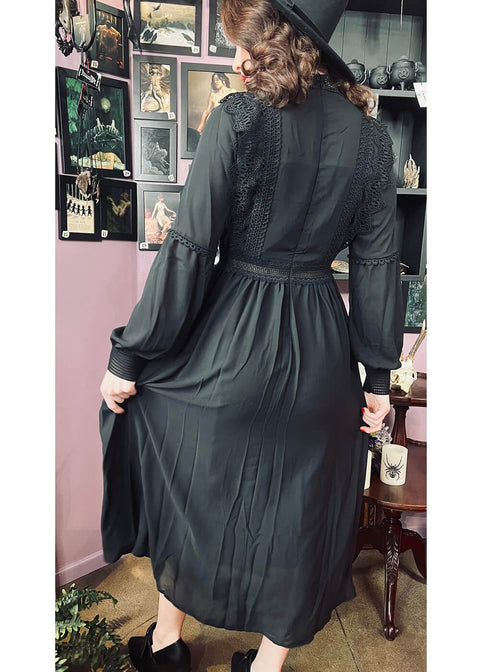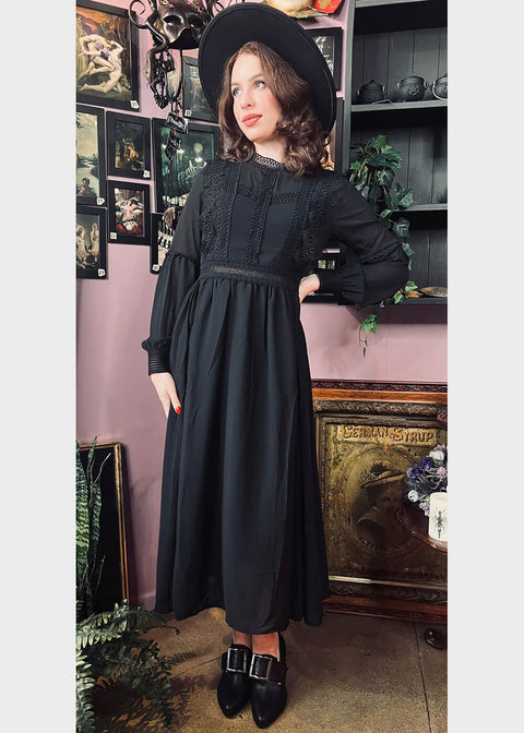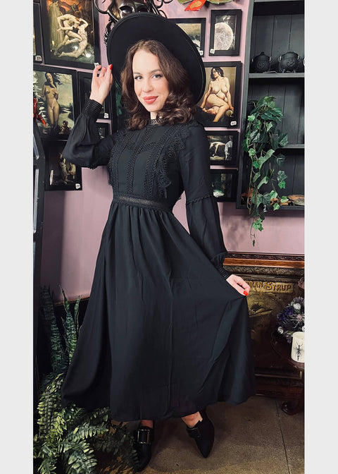 Agatha forener elegance, femininitet og mystik! Denne smukke maxikjole har en høj halsudskæring med lange biskopsærmer og er prydet med fine blonder på overkroppen. Nederdelen er vid og opfylder alle dine dark cottagecore-drømme! Om du er på vej til din coven eller din kontorhave: hvor vil du først bære din Agatha?