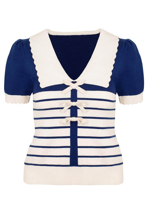 Dieses navy-weiße Stricktop ist ein echtes Must-Have, das sofort Lust auf einen sonnigen Nachmittag macht: Körbchen packen, Decke ausbreiten und einfach genießen! Die verspielten Streifen, der cremige Kragen mit gewelltem Rand und die drei Schleifchen auf der Vorderseite verleihen ihr genau die retro-süße Note, die dein Outfit zum Strahlen bringt ♥