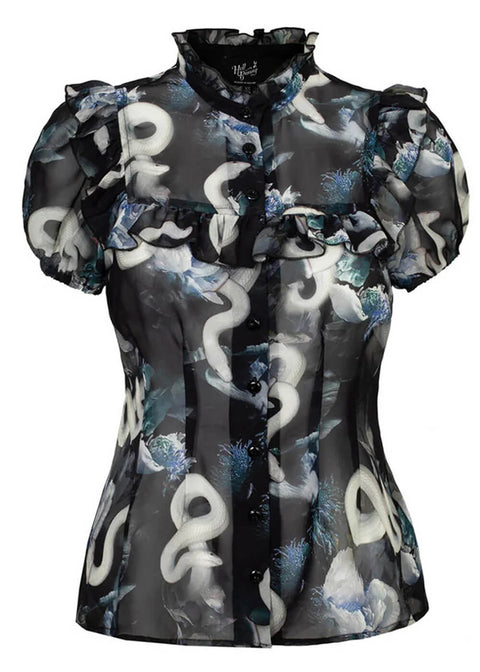 Die Serpent Blouse kombiniert einen floralen Print mit einem Schlangenakzent: süß und gefährlich in einem Atemzug. Das quadratische Brust- und Rückenteil mit Rüschensaum verleiht eine verspielte, nostalgische Note, während die Puffärmel für einen zusätzlichen Hauch von Flair sorgen. Trage sie zu Schwarz für maximale Mystik oder mit Denim für einen ssspektakulären Twist ♥