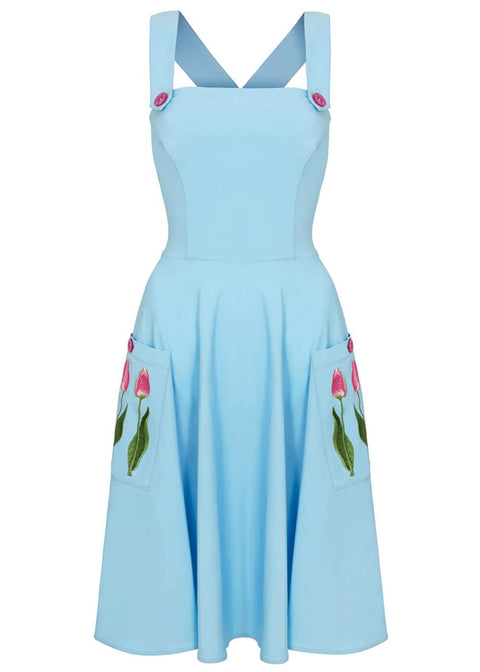 Himmelblau wie der klare Himmel, mit fröhlichen Tulpen auf den aufgenähten Taschen, die bei jedem Schritt mit dir tanzen. Die breiten Träger kreuzen sich verspielt auf dem Rücken und verleihen ihr diesen unwiderstehlichen Vintage-Pinafore-Look — süß, luftig und bereit für Picknicks, Märkte und sonnige Spaziergänge. Trägst du sie so, oder mit einer eleganten Bluse oder einem verspielten Oberteil?
