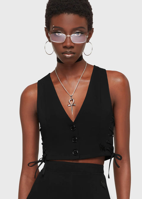 Chaleco Nexara de Killstar en color negro, con un diseño alternativo y corte contemporáneo. Ideal para looks góticos y urbanos, con detalles metálicos y acabado resistente.