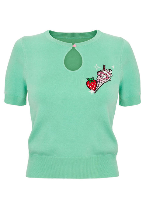 Raikas mintunvihreä sävy ilahduttaa, ja rintaa koristaa kirjailtu jäätelö ja mansikka pienillä kimaltavilla yksityiskohdilla, kuin myyntitiskistä. Avanne napilla antaa flirttailevan ilmeen, ja vartalonmyötäinen leikkaus tekee topista helpon yhdistää hulmuavaan hameeseen, neuletakkiin tai lempifarkkuihin. Tuntuuko makeanhimo?