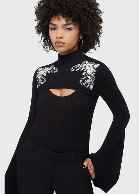 Bolero, joka tuntuu lämpimältä halaukselta mutta näyttää siltä kuin olisit astunut gotiikkaan kuuluvasta sadusta... Petal & Pine yhdistää pehmeän, joustavan neuloksen ja helmiäismäiset kukka- ja piikkikirjailut — suloinen ja pisteliäs, juuri sopivasti 🖤