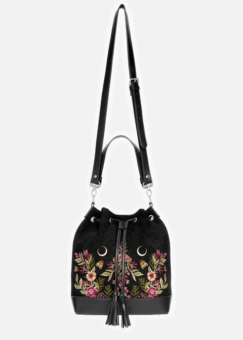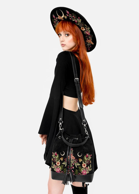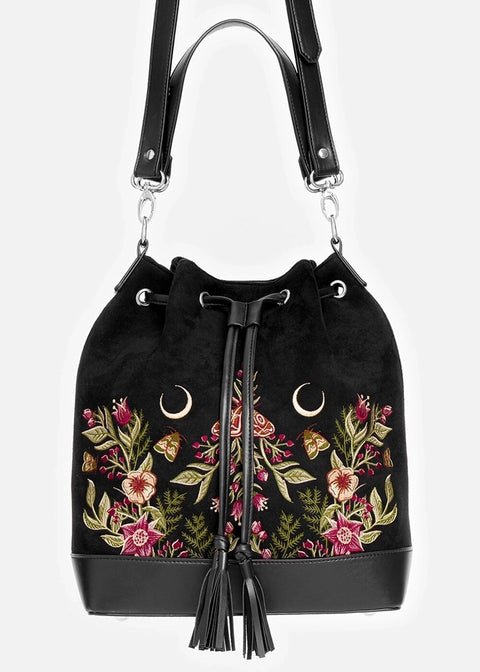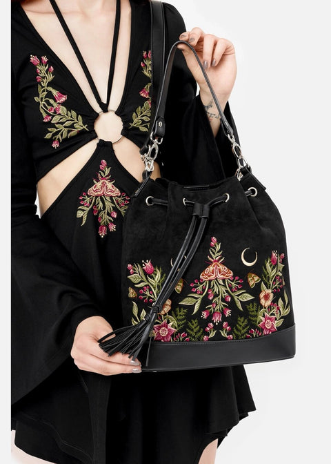 Le nom Wildflower évoque déjà des images féeriques, n'est-ce pas ? Vous vous croyez dans un conte ? Ce n'est pas le cas, car elle peut devenir vraiment vôtre ! Ce magnifique sac seau est à couper le souffle avec son faux-suède noir, orné de broderies mystiques et conçu pour un confort d'utilisation optimal... Vos Vibes Witchy sont toujours à portée de main ♥