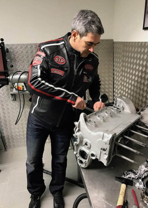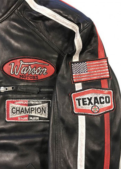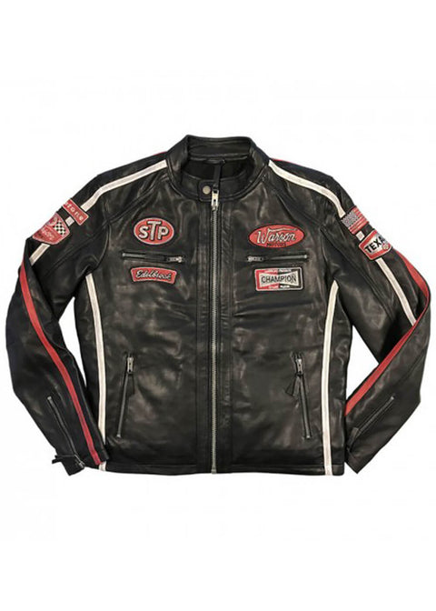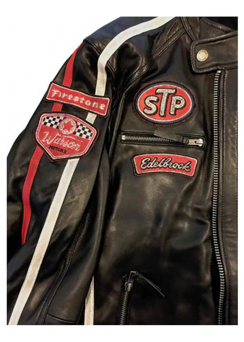 Experience your own Grand Prix with this stunning motorcycle jacket, made from beautifully soft, real sheep leather. The patches of brands like Warson Motors, Champion and STP stand out strong against the leather, as do the contrast stripes.