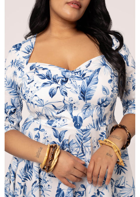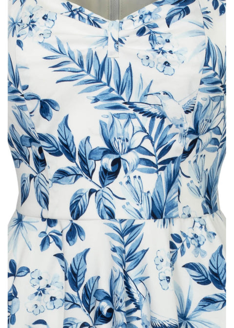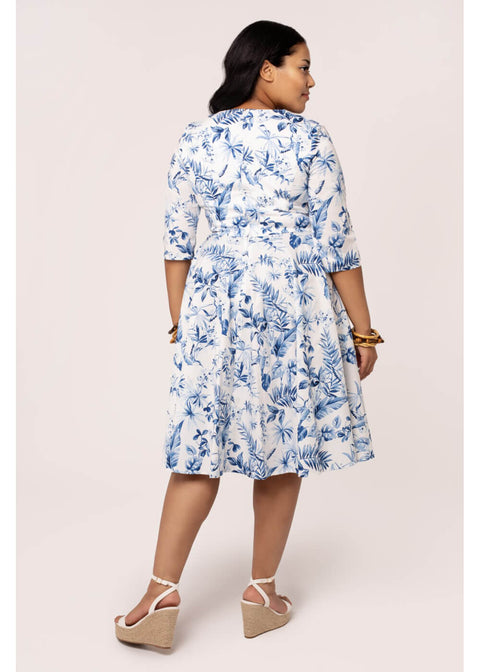 Delft Blue, Chinese porcelain... what do you see in Adeline? Your newest darling, of course! This swing dress features a stunning blue print filled with plants and birds on a white background, and it fits perfectly thanks to its beautiful cotton mix with princess seams and three-quarter sleeves... For tea, the office, or on vacation: Adeline is your new favorite!
