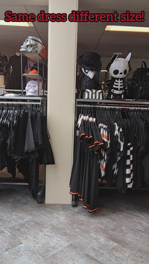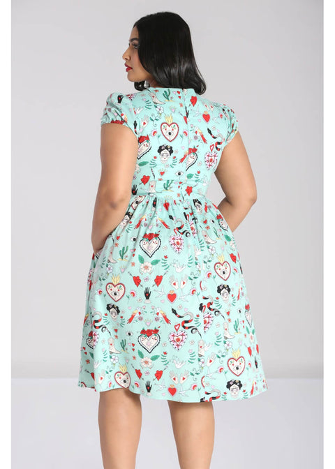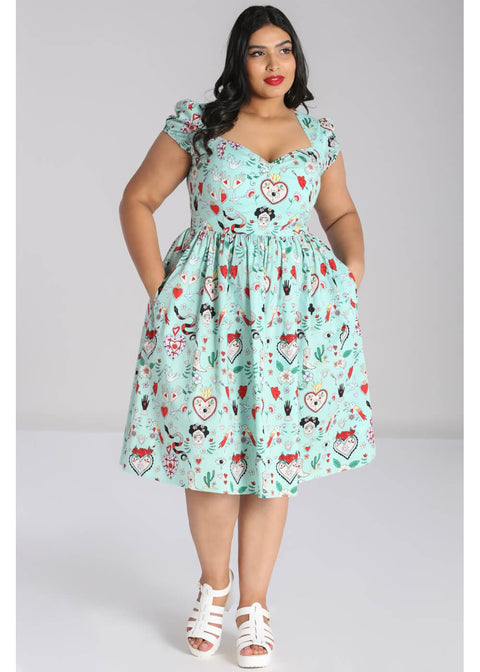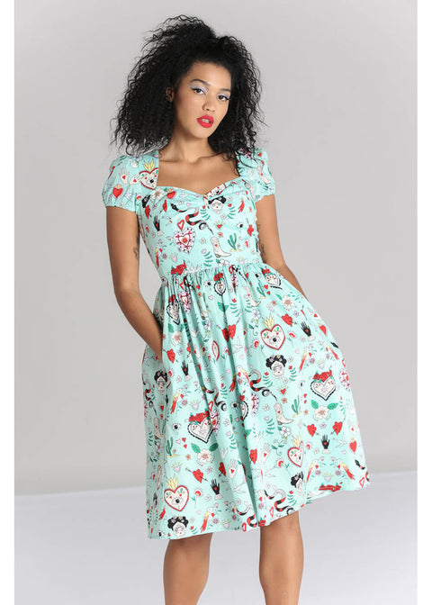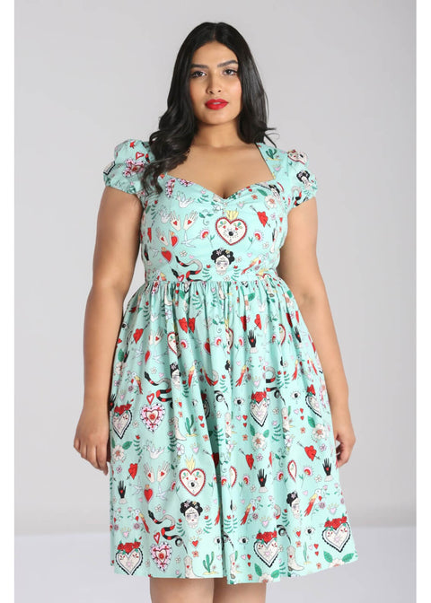 Let yourself be hypnotized by its Dias de los Muertos-inspired print! The top almost looks like a bolero with its short puffy sleeves. The heart-shaped neckline has an elegant pleat in the middle because it is fixed, for an extra charming bust ;)