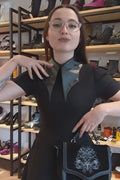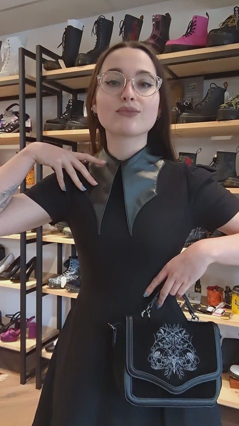 She has an A-line skirt, fitted at the waist and an absolute showstopper of a vegan leather collar in the shape of bat wings. No garment combines simplicity and goth glam as well as she does. Her fabric feels soft and stretchy, so she fits like a glove. This darling will flutter straight into your shopping basket!