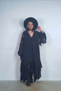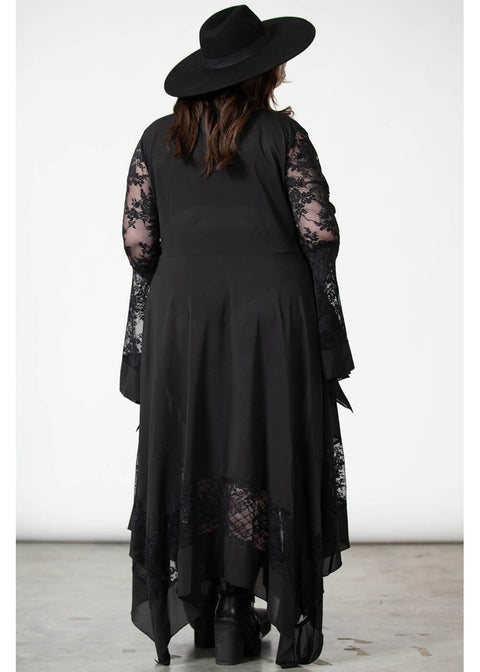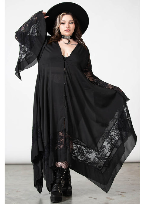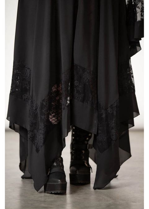 Mysterious, dramatically pretty...love at first sight, right? She's made of a smooth and light fabric with fine stretch, which make her dance around you beautifully. And that is quite the sight with her parts of semi-transparent lace and just as transparent chiffon! She closes with buttons in the front and flares elegantly from there, down to the playfully hanky hem.