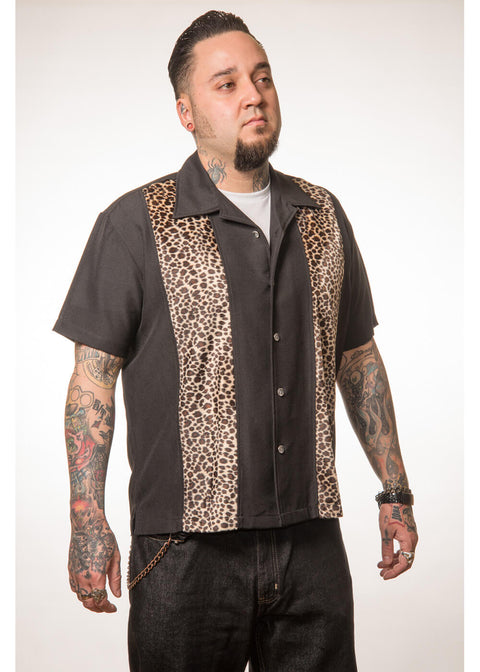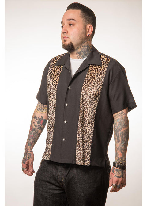 Steady Clothing Mens Leopard Panel Button Up Shirt Black